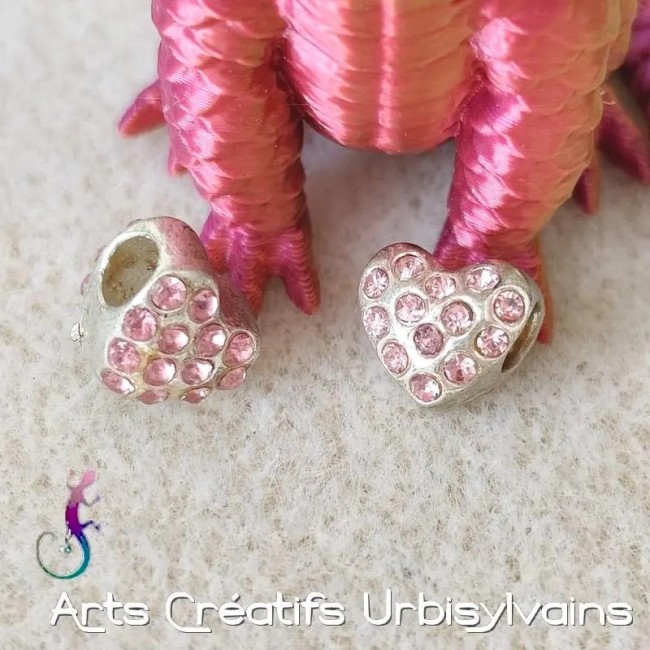 Perle cœur en métal argenté avec strass rose pour bracelet ou collier européen