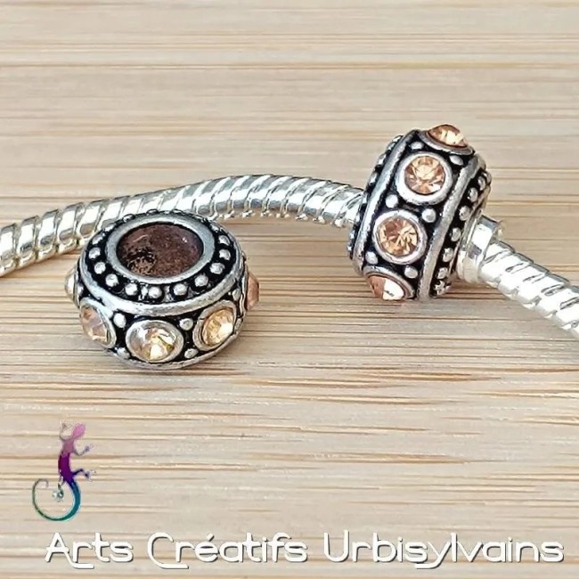 Lot de 2 perles rondelles en métal argenté avec strass saumon pour bracelet ou collier européen
