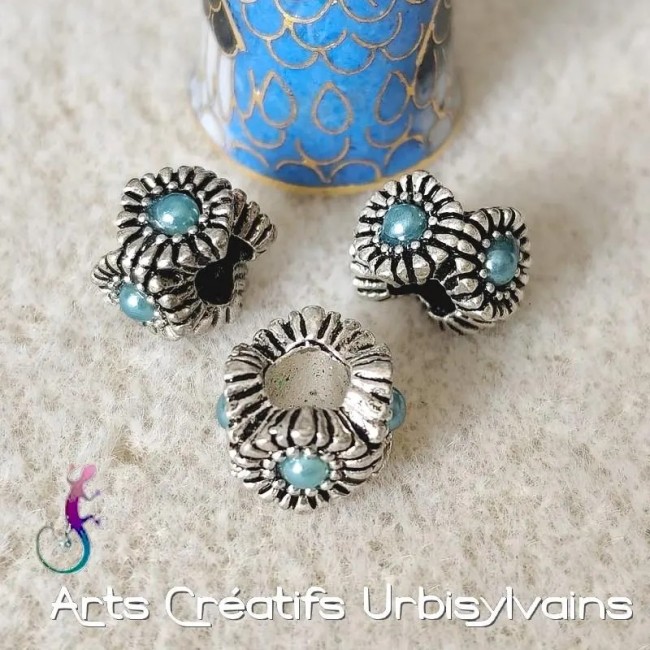 Lot de 2 perles en métal argenté antique avec perles bleues pour bracelet ou collier européen