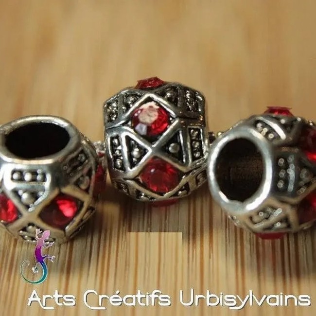 Perle en métal argenté avec strass rouge pour bracelet ou collier européen