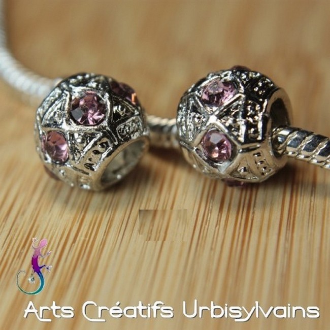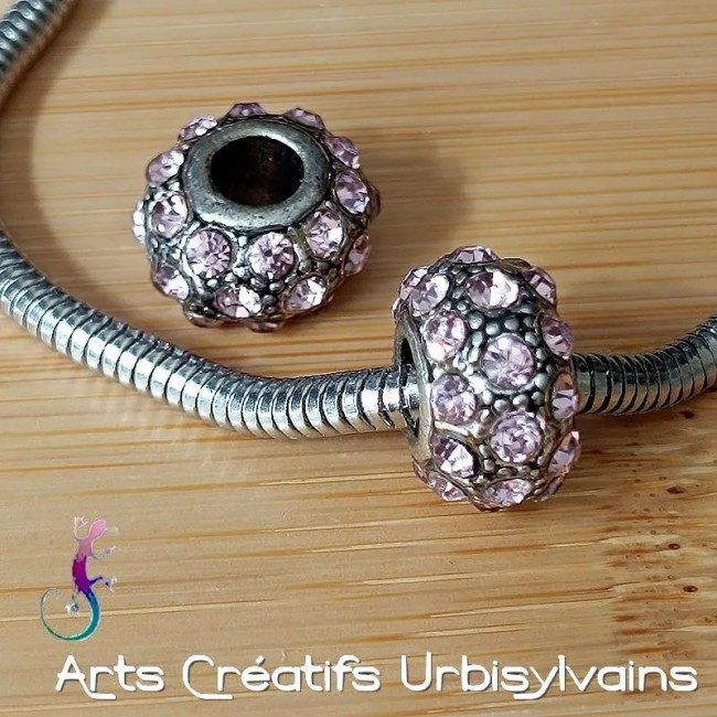 Perle vintage en métal argenté et cristaux roses pour bracelet ou collier européen