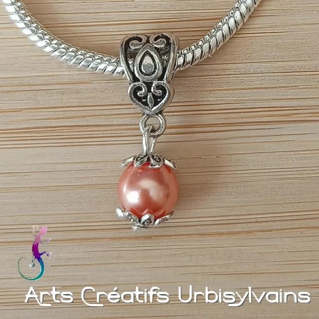 Bélière en métal argenté ciselée et perle nacrée rose orangée pour bracelet ou collier européen