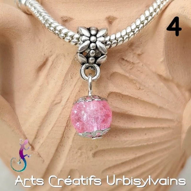 Bélière en métal argenté ciselée et perle en verre craquelé rose pour bracelet ou collier européen