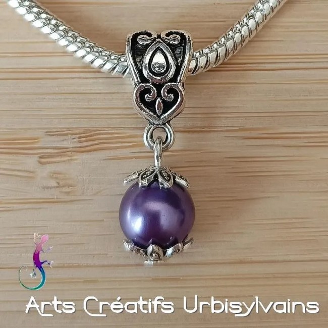 Bélière en métal argenté ciselée et perle nacrée violette pour bracelet ou collier européen
