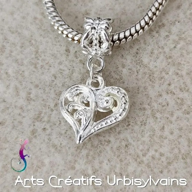 Bélière ciselée en métal plaqué argent et cœur en métal plaqué argent pour bracelet ou collier européen