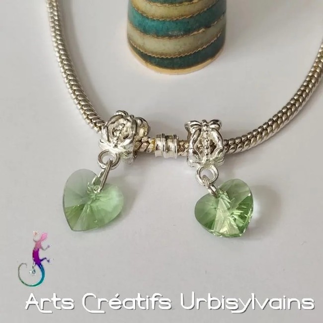 Lot de 2 bélières en métal argenté ciselé et pendentif cœur en cristal vert pour bracelet ou collier européen