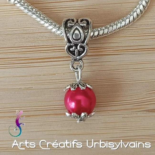Bélière en métal argenté ciselée et perle nacrée rouge pour bracelet ou collier européen