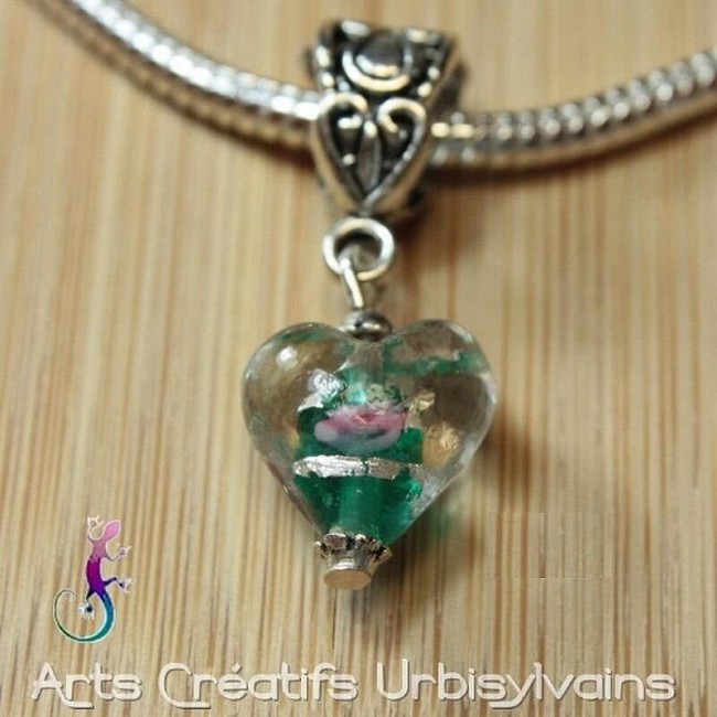 Bélière ciselée en métal argenté et perle coeur en verre murano vert et fil d'argent pour bracelet ou collier européen