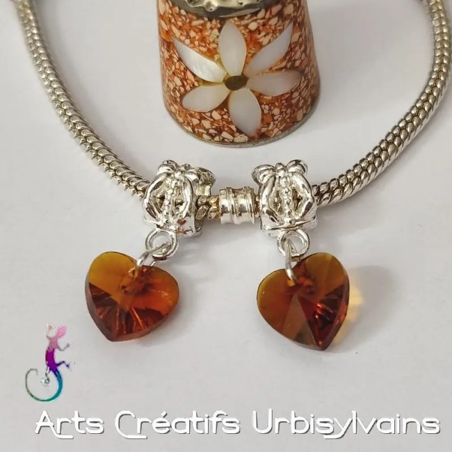 Lot de 2 bélières en métal argenté ciselé et pendentif cœur cristal miel pour bracelet ou collier européen