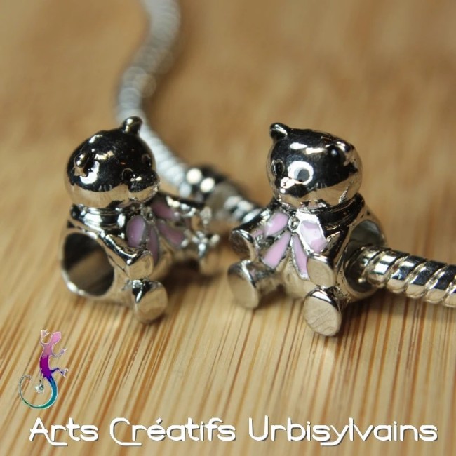 Perle en métal plaqué argent nounours rose pour bracelet ou collier européen