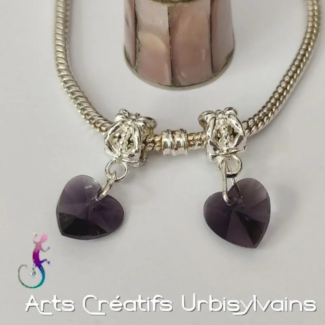 Lot de 2 bélières en métal argenté ciselé et pendentif cœur cristal violet pour bracelet ou collier européen