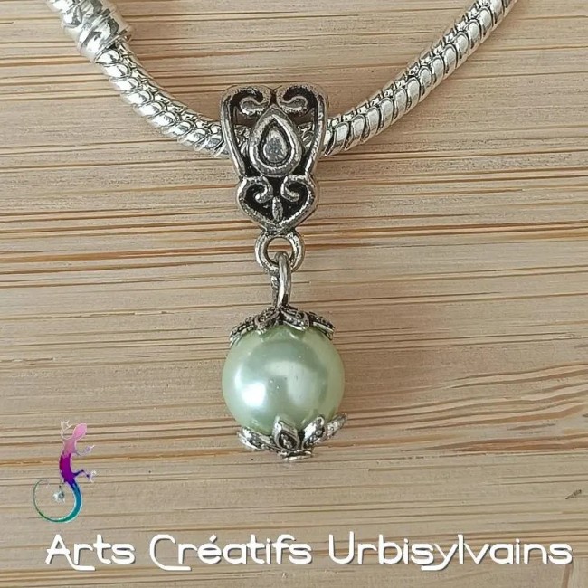 Bélière en métal argenté ciselée et perle nacrée vert pâle pour bracelet ou collier européen