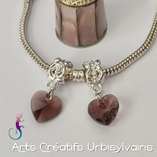 Bélière en métal argenté et coeur en verre facetté vieux rose pour bracelet ou collier européen