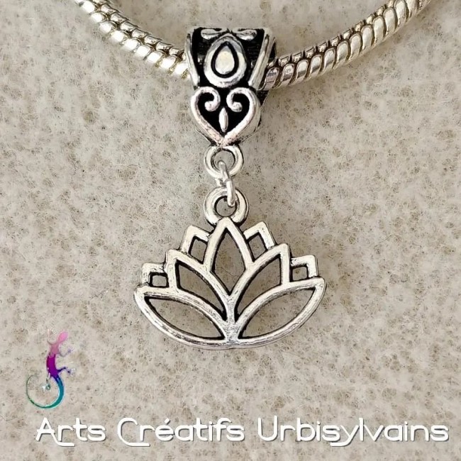 Bélière en métal argenté ciselée et breloque fleur de lotus pour bracelet ou collier européen