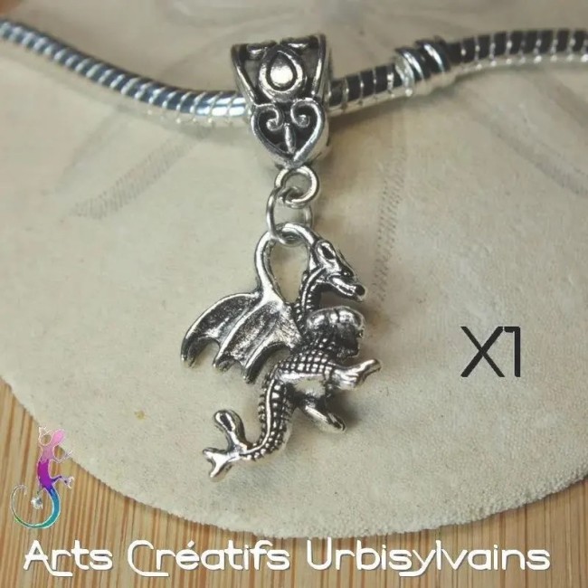 Bélière en métal argenté ciselée et breloque dragon en métal argenté antique pour bracelet ou collier européen