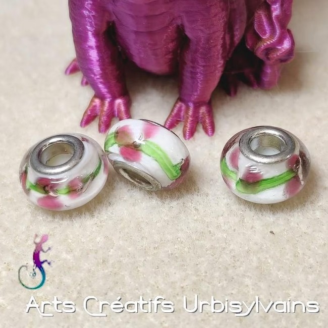 Lot de 3 perles en verre lampwork murano blanc, rose et vert pour bracelet ou collier européen