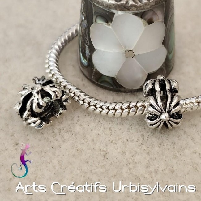 Lot de 2 perles fleur en métal argenté pour bracelet ou collier européen