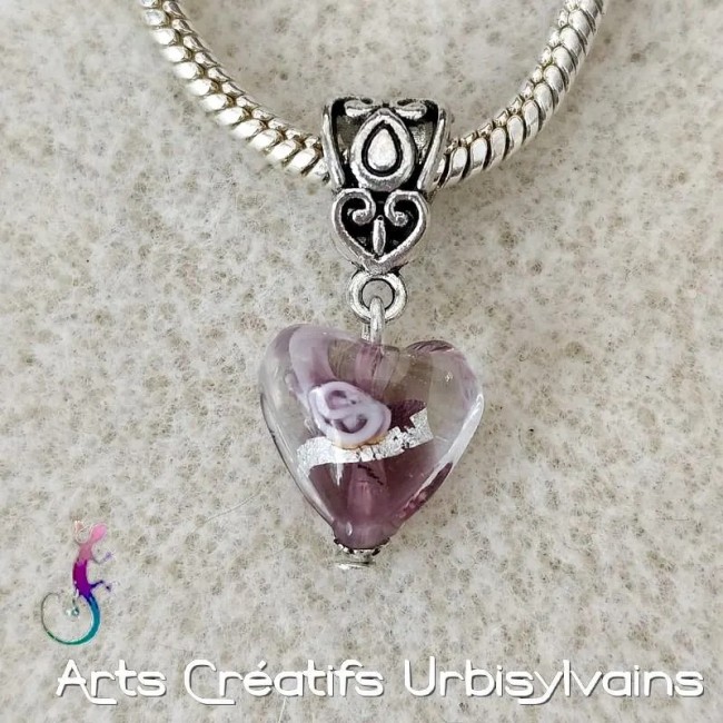 Bélière en métal argenté et coeur en verre violet pour bracelet ou collier européen