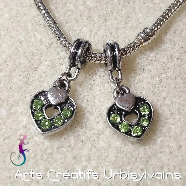 Lot de 2 bélières en métal argenté, cœur strass verts pour bracelet et collier européen